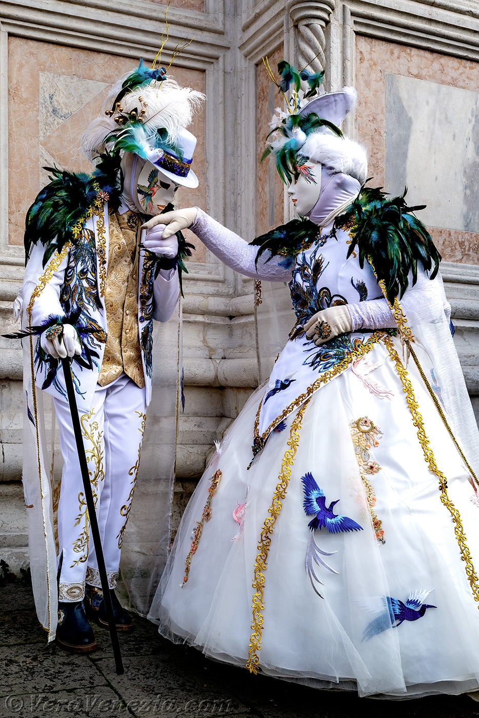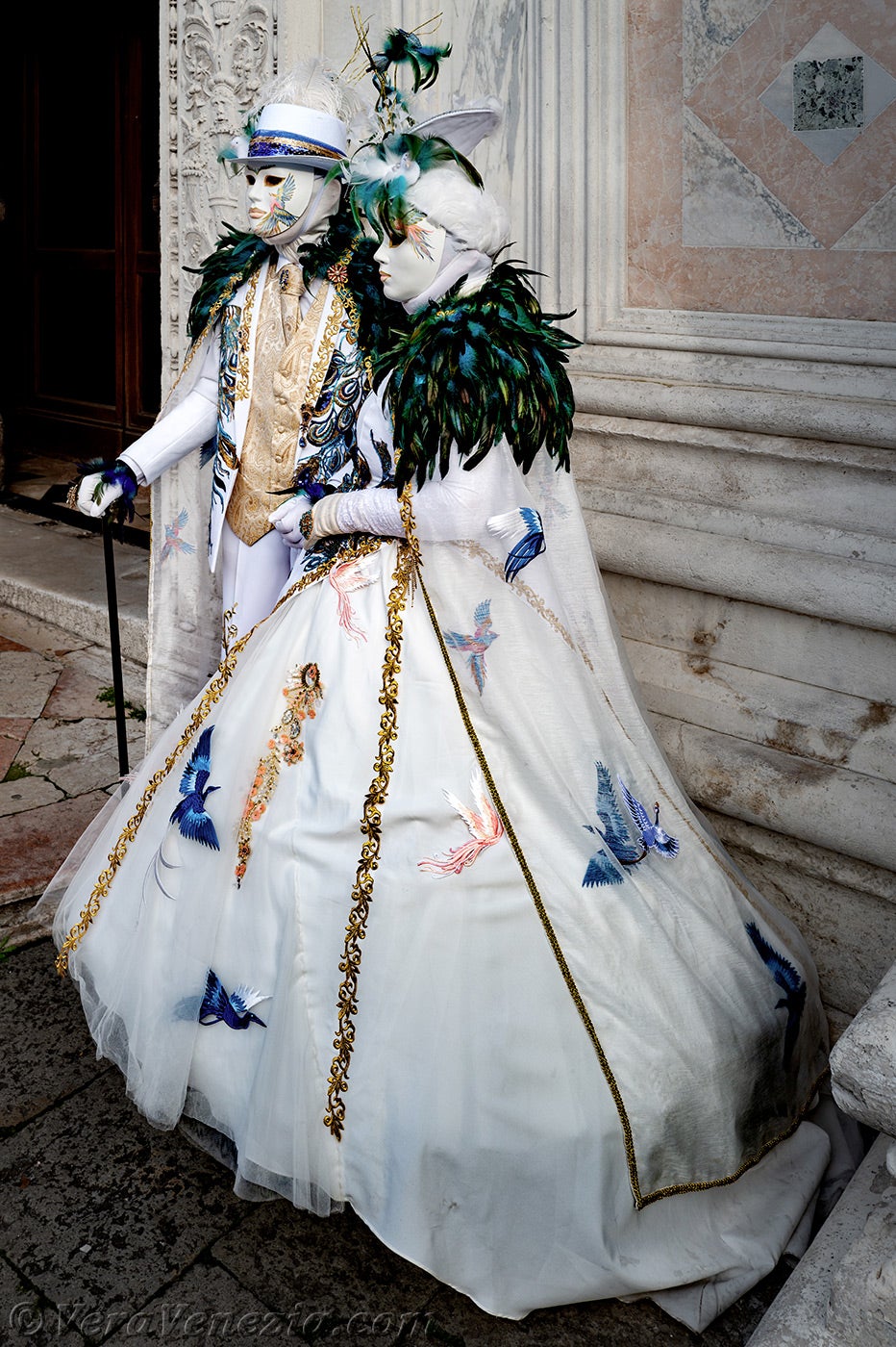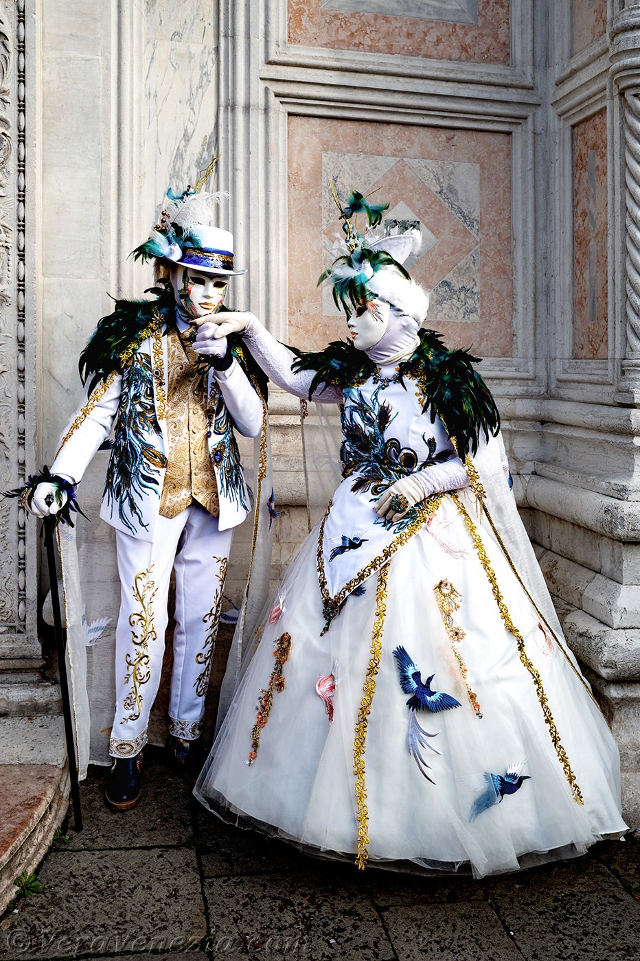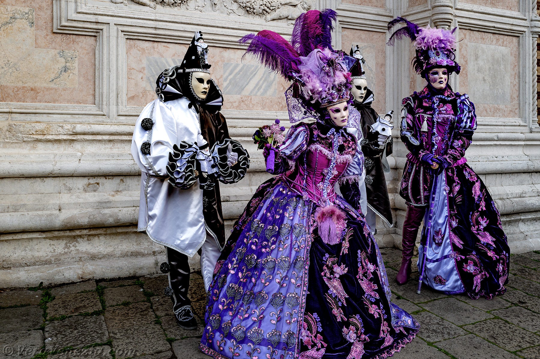 Davanti alla chiesa di San Zaccaria, una bella dama, adornata di piume e fiori primaverili, apriva il corteo, seguita da una coppia di eleganti uccelli dal piumaggio verde scuro.Questi ultimi erano seguiti dai due Pierrot e da due eleganti signore fiorite, vestite con abiti malva e porpora.