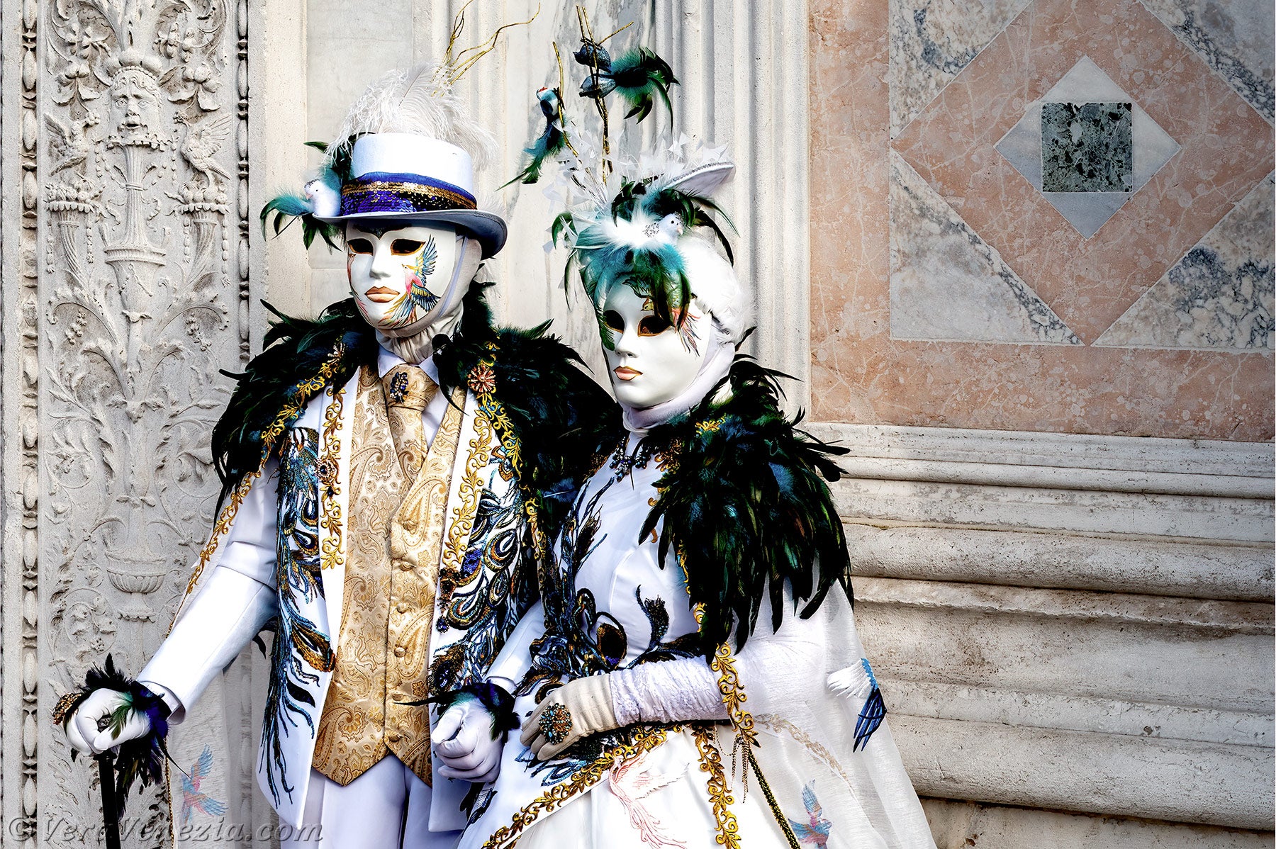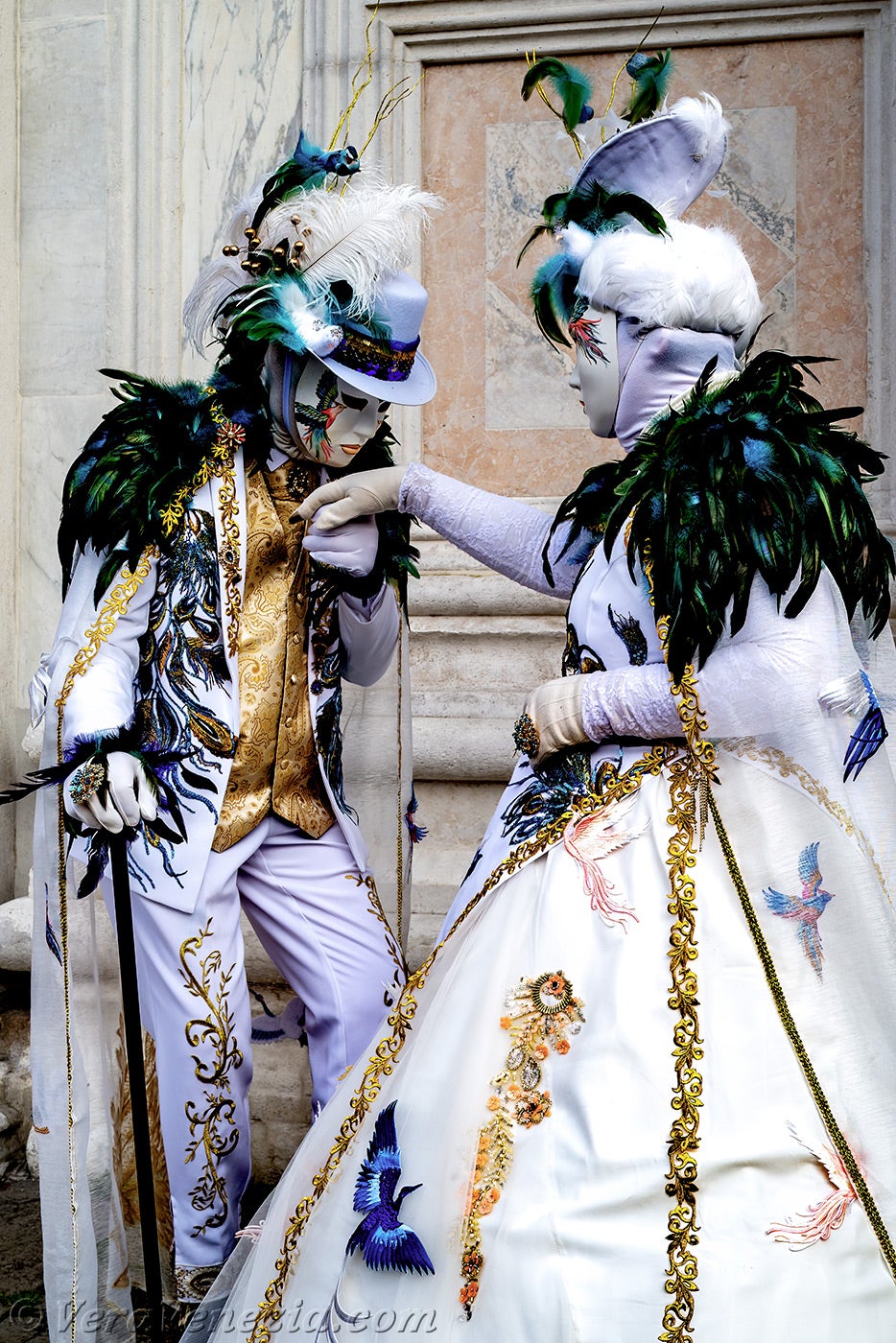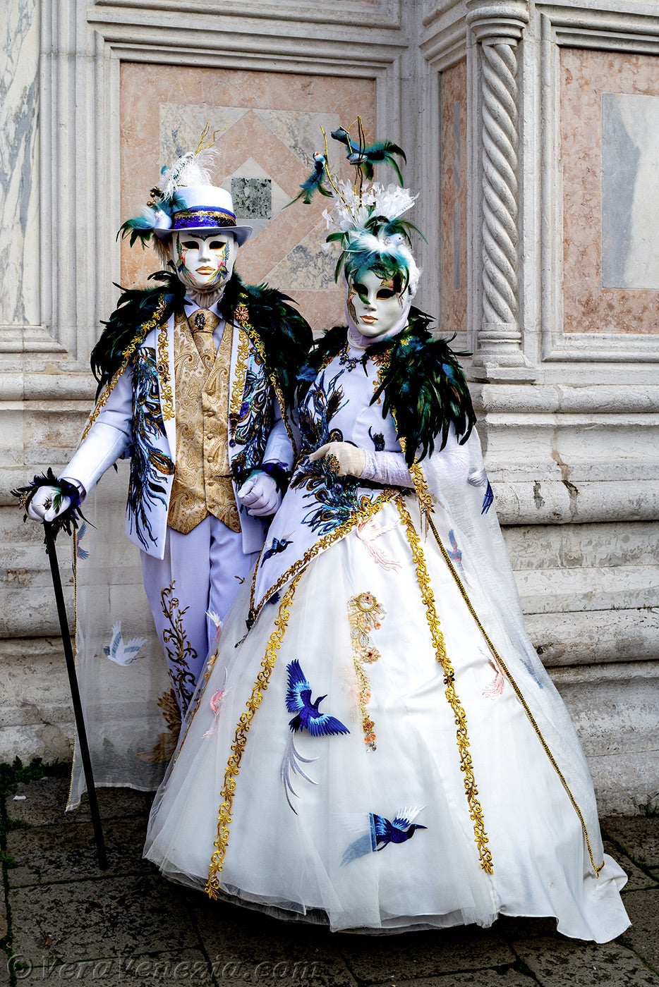 Davanti alla chiesa di San Zaccaria, una bella dama, adornata di piume e fiori primaverili, apriva il corteo, seguita da una coppia di eleganti uccelli dal piumaggio verde scuro.Questi ultimi erano seguiti dai due Pierrot e da due eleganti signore fiorite, vestite con abiti malva e porpora.