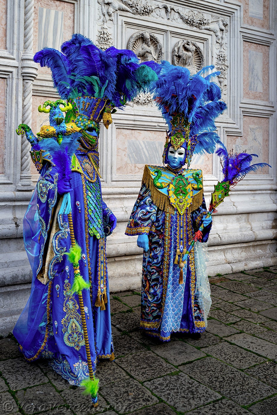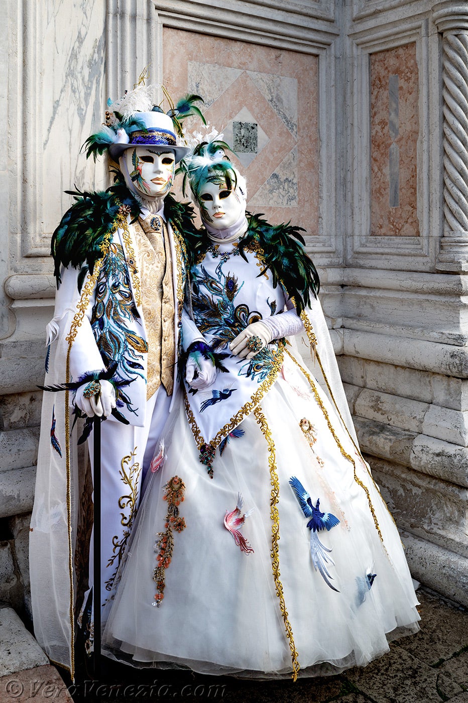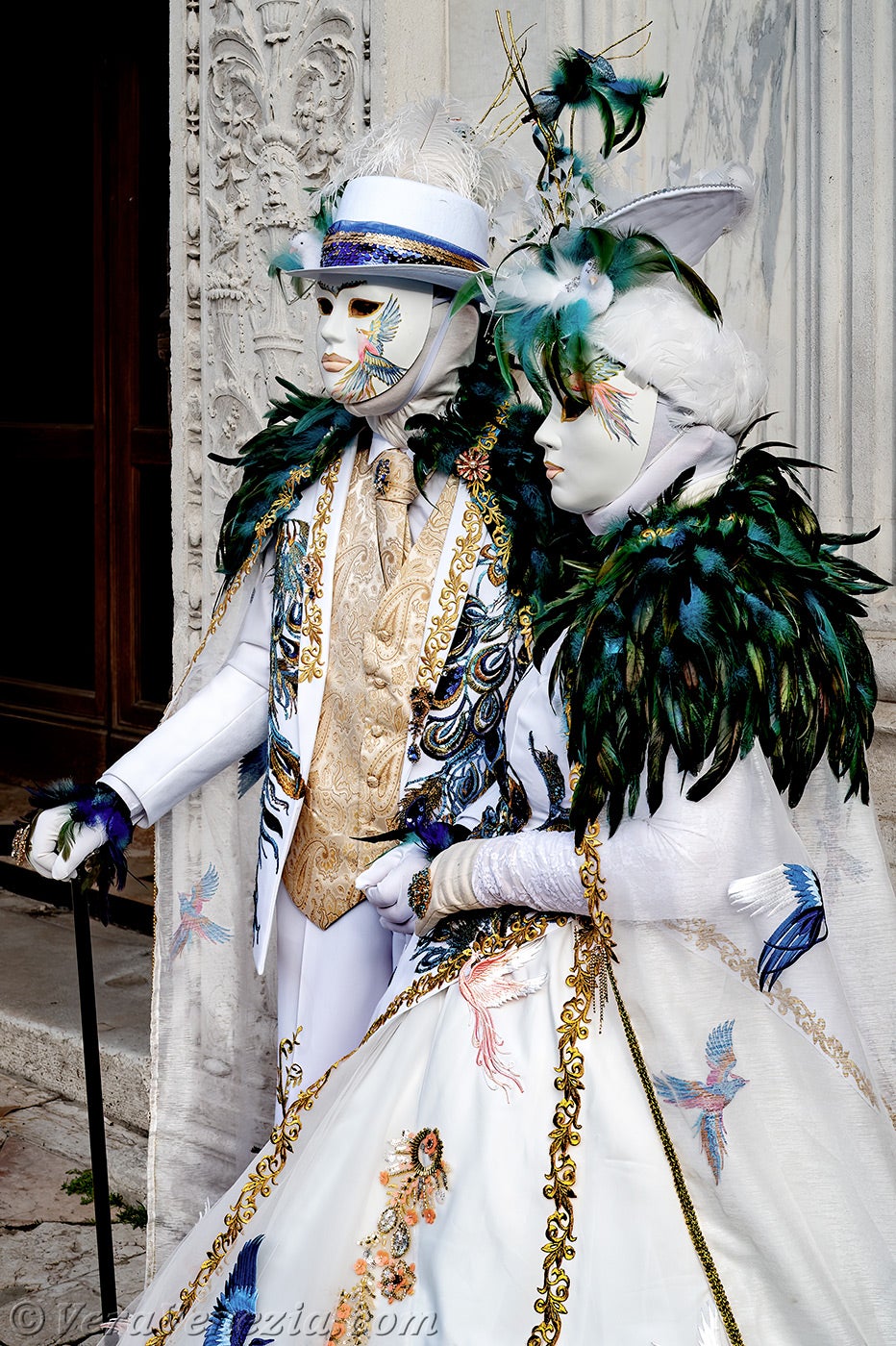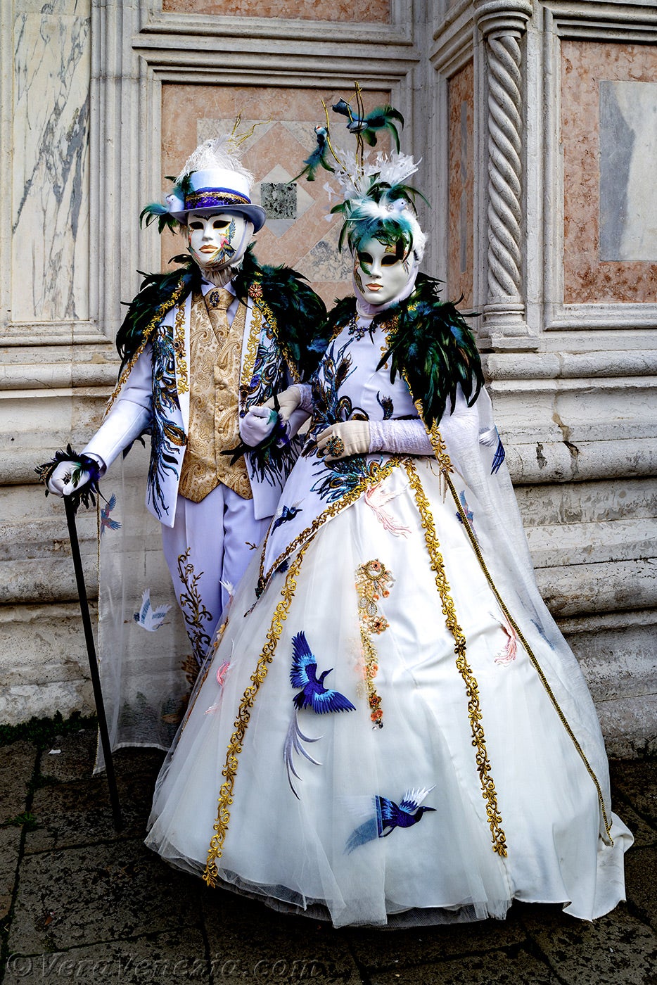Davanti alla chiesa di San Zaccaria, una bella dama, adornata di piume e fiori primaverili, apriva il corteo, seguita da una coppia di eleganti uccelli dal piumaggio verde scuro.Questi ultimi erano seguiti dai due Pierrot e da due eleganti signore fiorite, vestite con abiti malva e porpora.