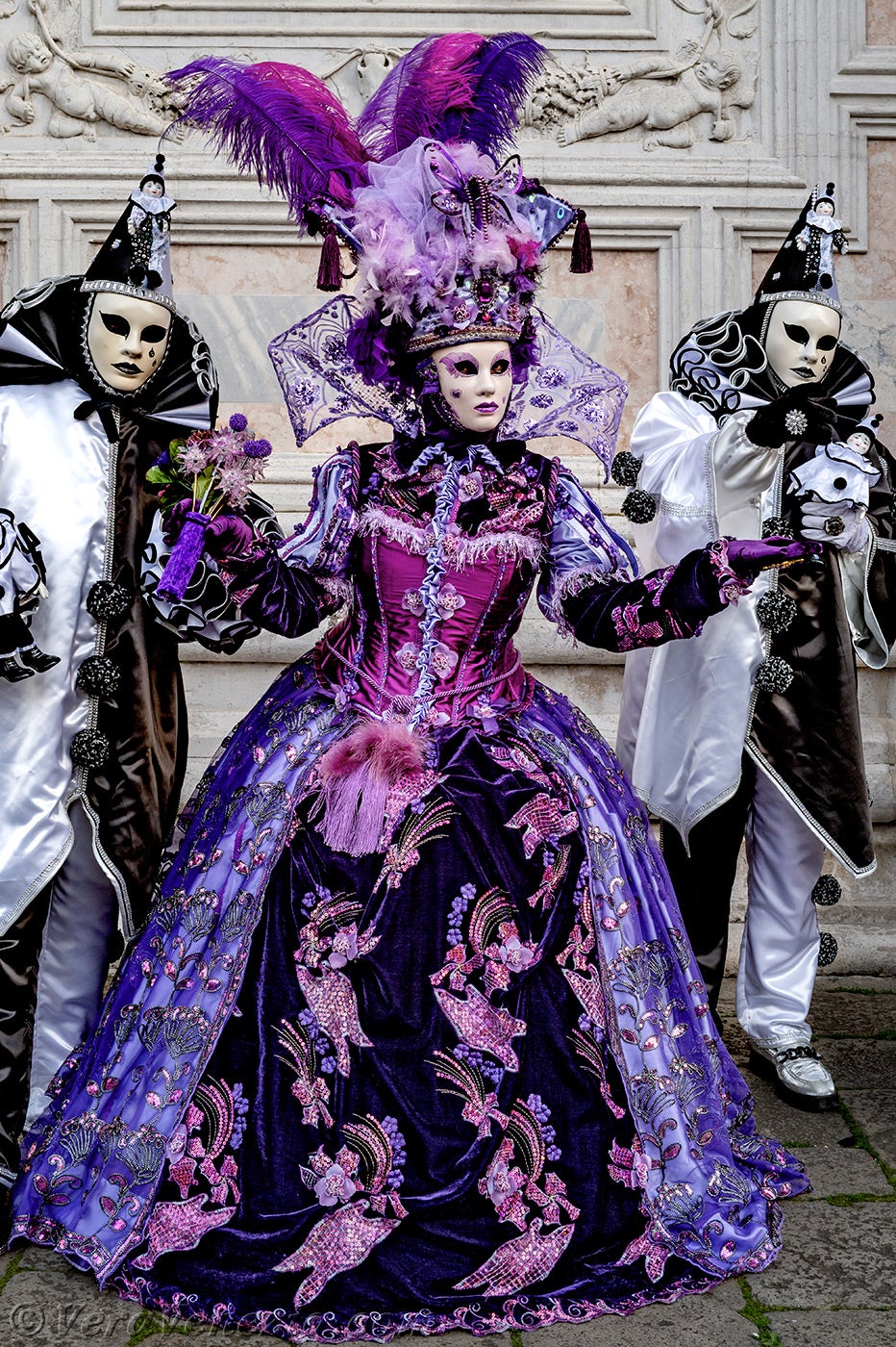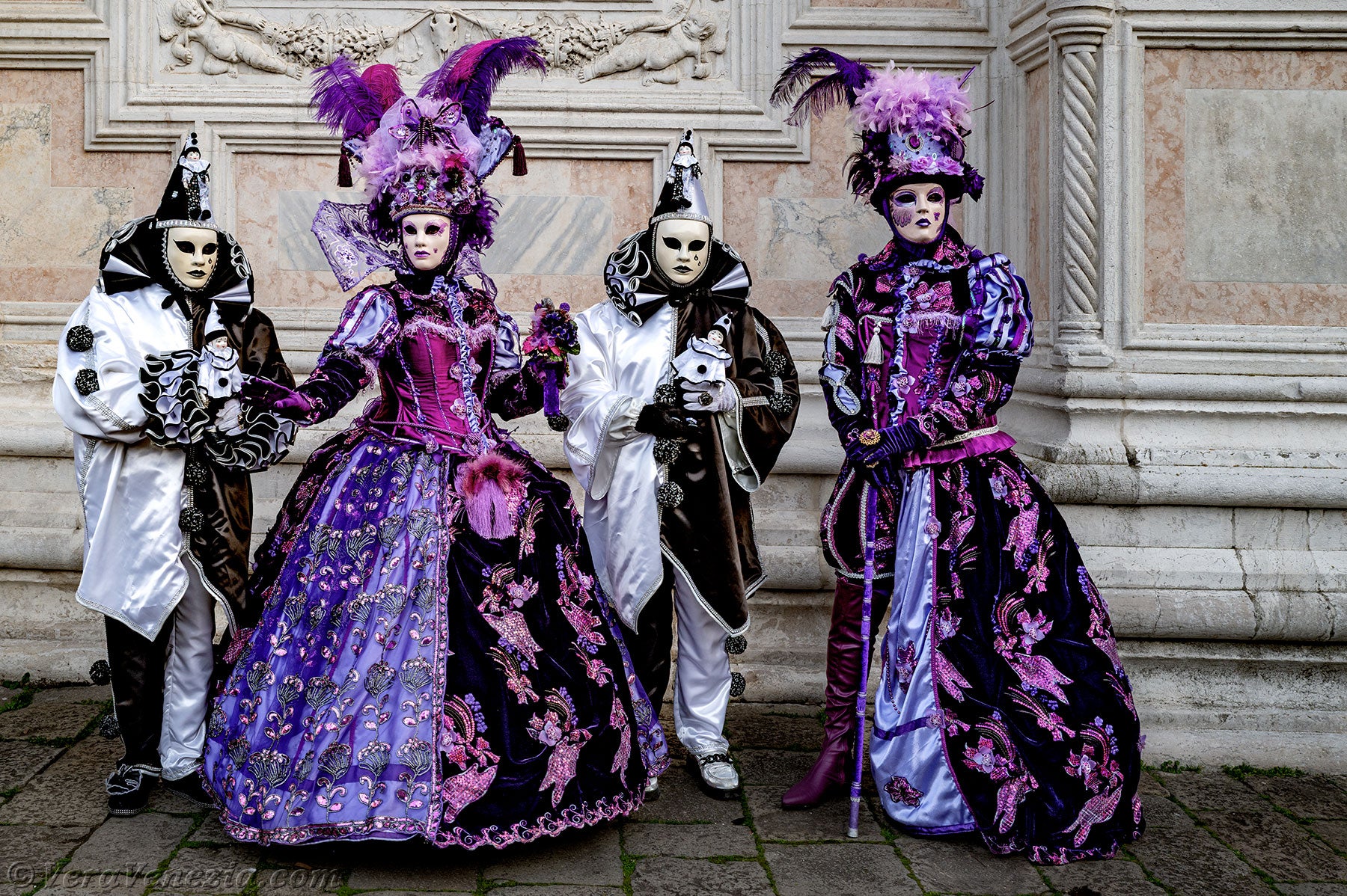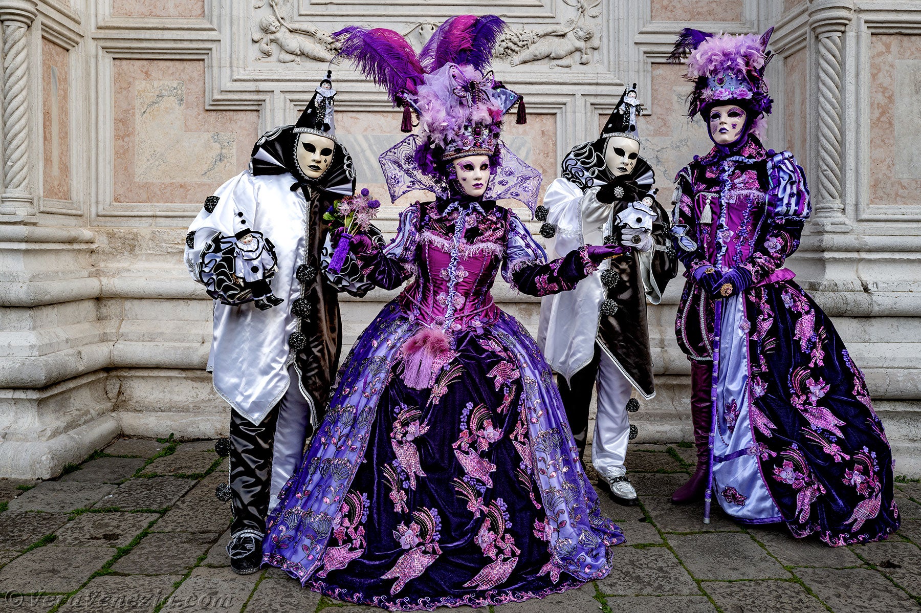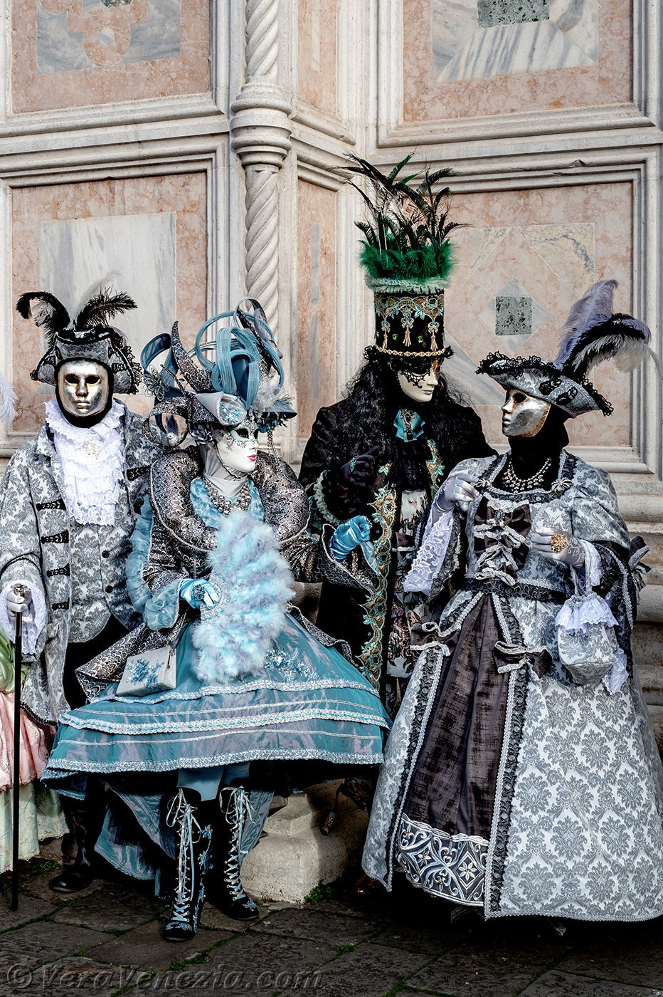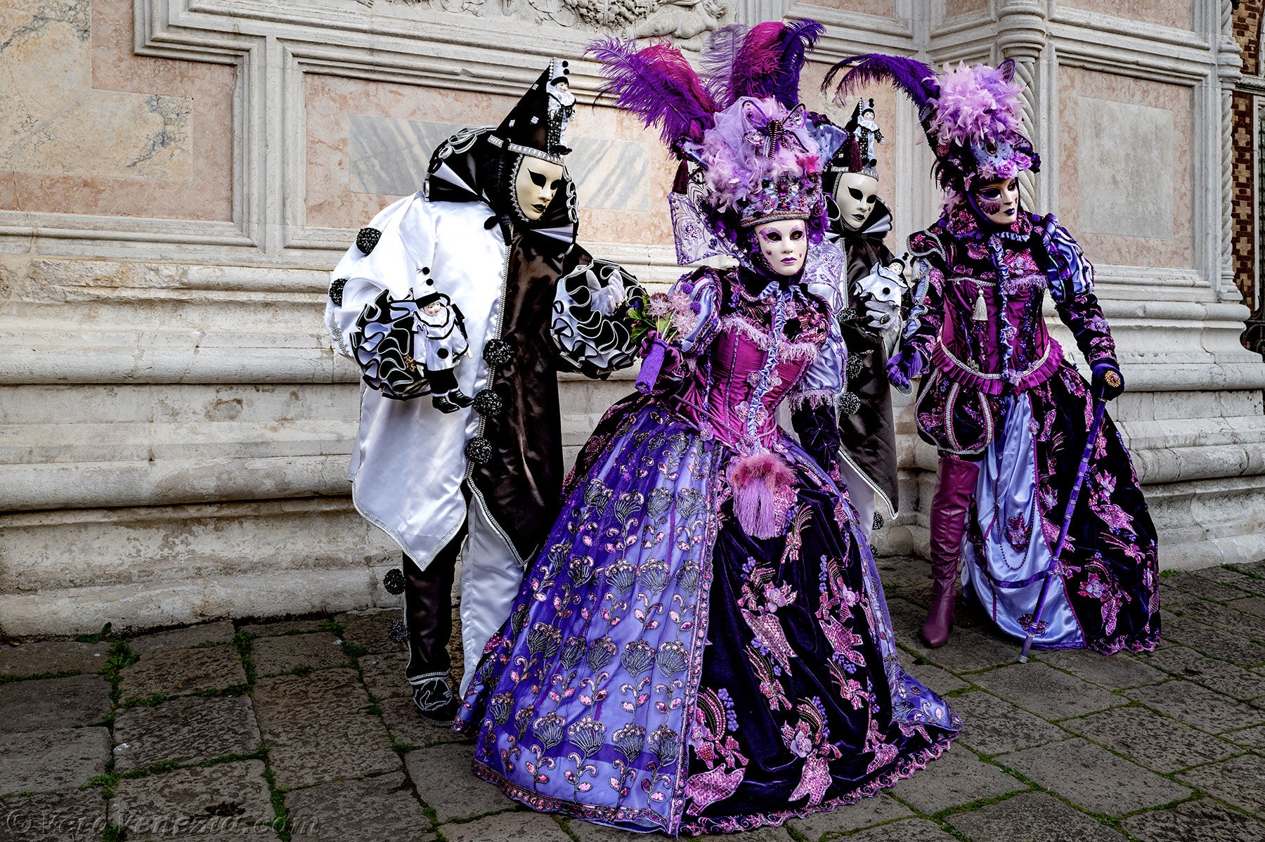 Le due belle dame vestite di malva e porpora, che accompagnavano i due Pierrot, ci hanno colpito per la loro raffinatezza e grazia, salutandoci con un grazioso inchino.Poco dopo, per la gioia dei nostri occhi, diversi gentiluomini e dame, vestiti sontuosamente e adornati di Gioielli, si sono presentati sul Campo San Zaccaria.