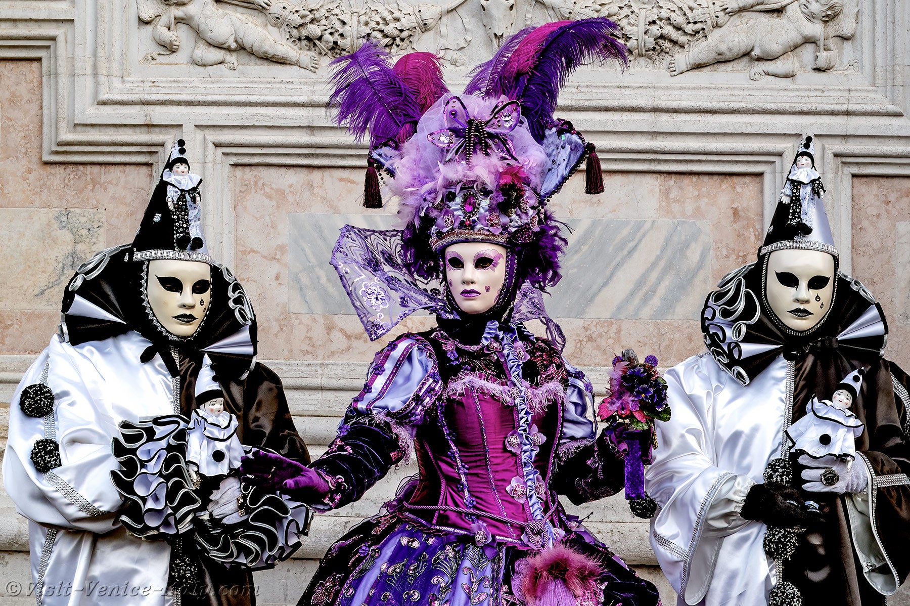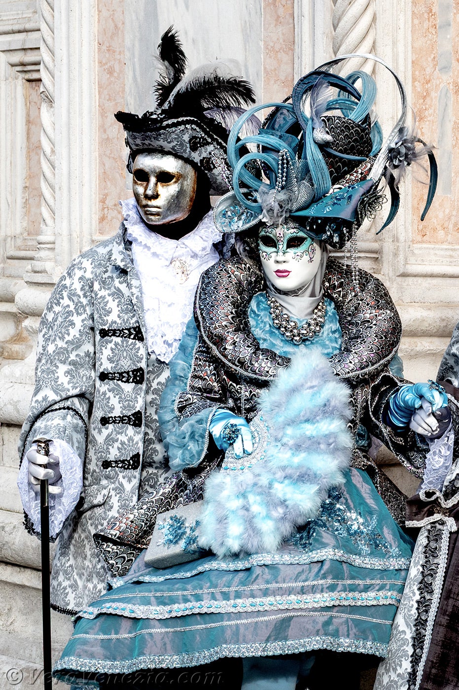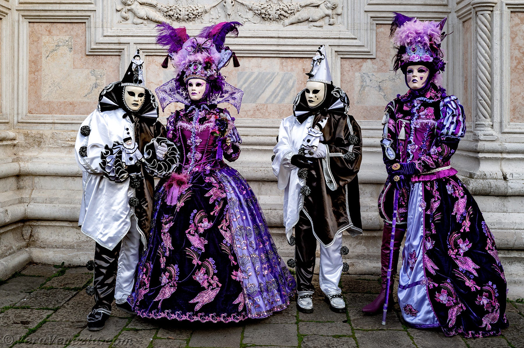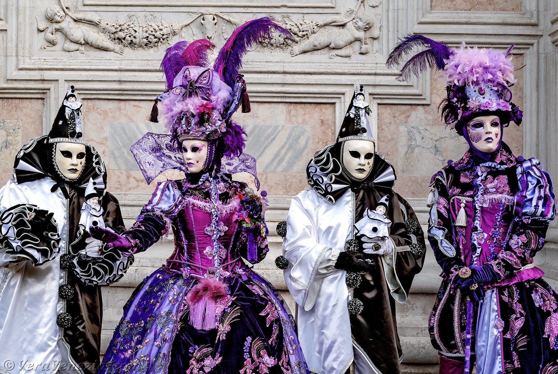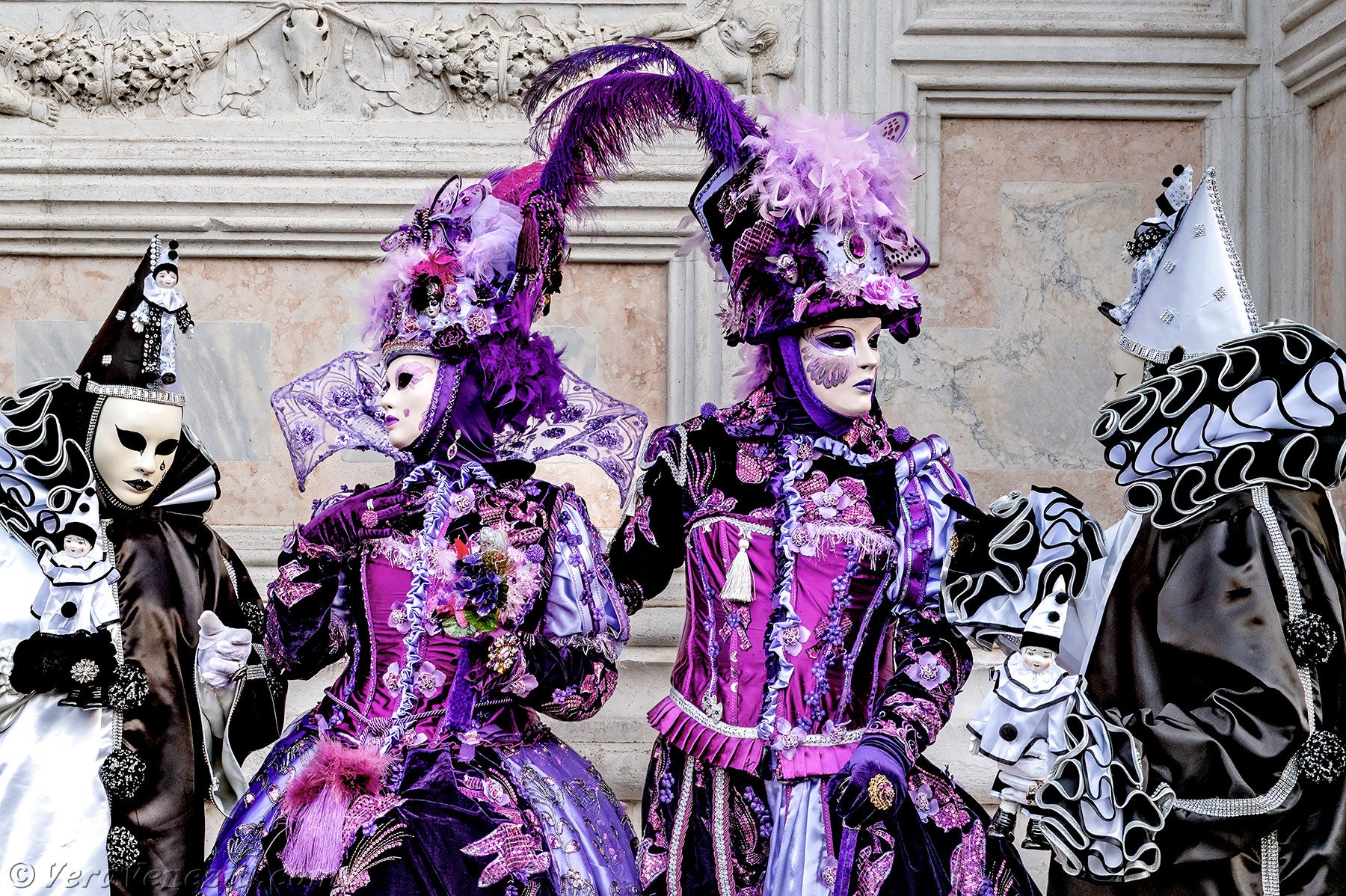 Le due belle dame vestite di malva e porpora, che accompagnavano i due Pierrot, ci hanno colpito per la loro raffinatezza e grazia, salutandoci con un grazioso inchino.Poco dopo, per la gioia dei nostri occhi, diversi gentiluomini e dame, vestiti sontuosamente e adornati di Gioielli, si sono presentati sul Campo San Zaccaria.