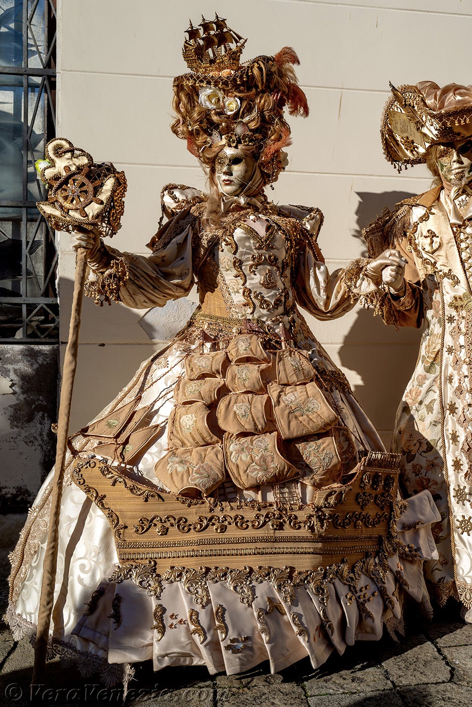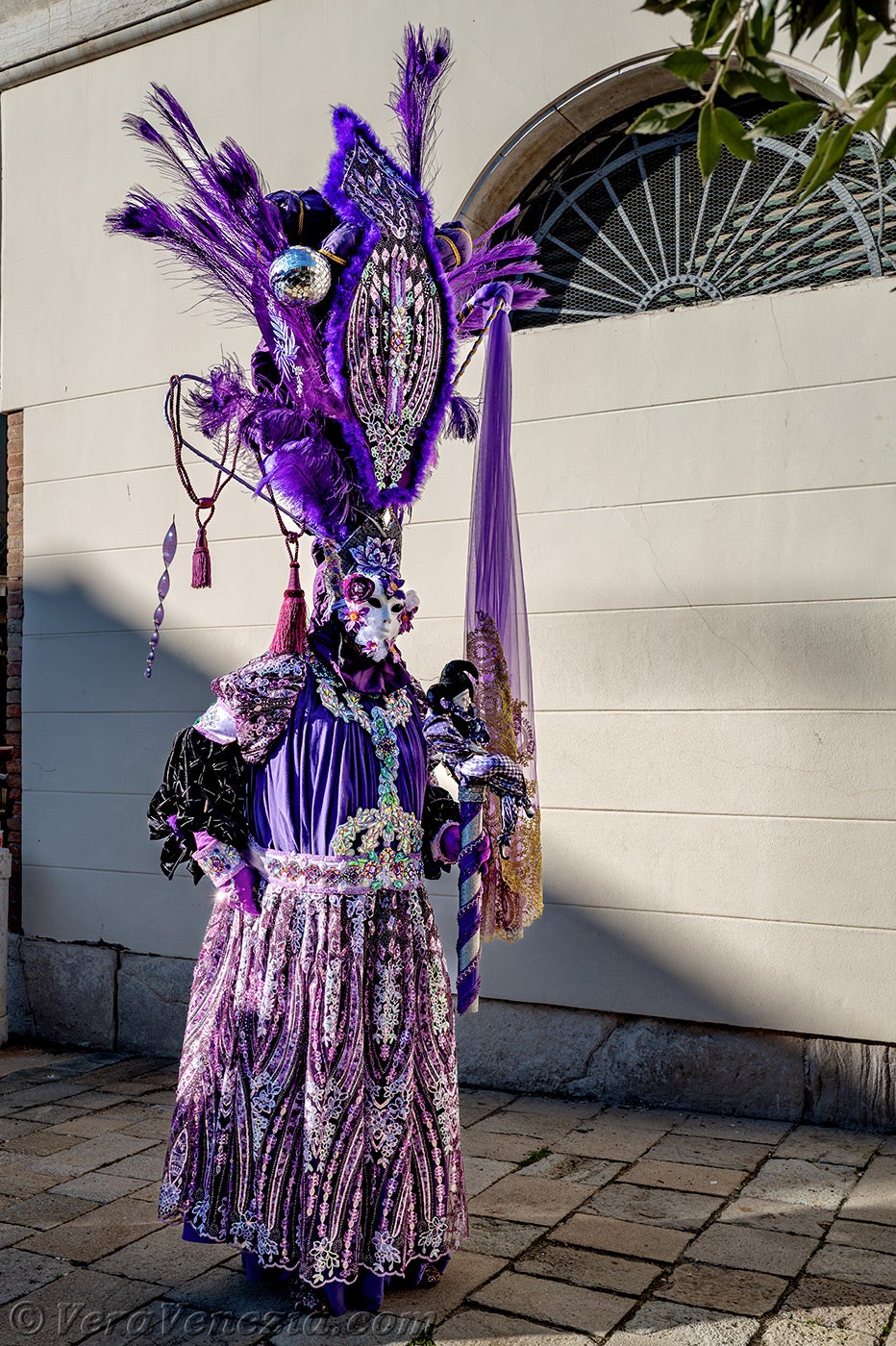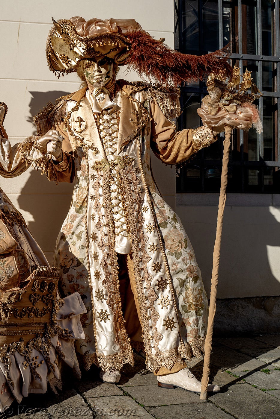 Con un copricapo alto quasi quanto il suo corpo, ricamato con fiori, Gioielli e piume color malva, questo imponente personaggio, armato di un bastone decorato con un giullare reale, ha deliziato gli spettatori del Carnevale di Venezia 2026 in Campo San Lorenzo.Una coppia di pirati vestiti con costumi beige e marroni, semplicemente stupendi, ci ha entusiasmato altrettanto.