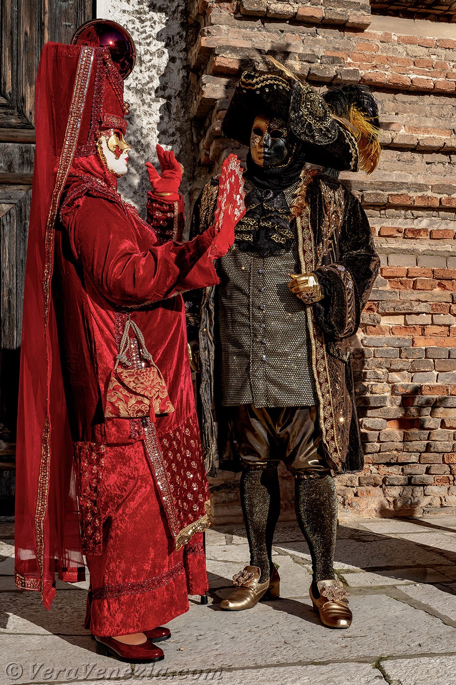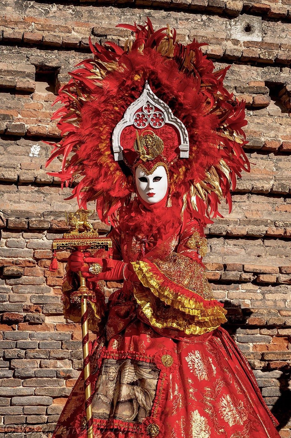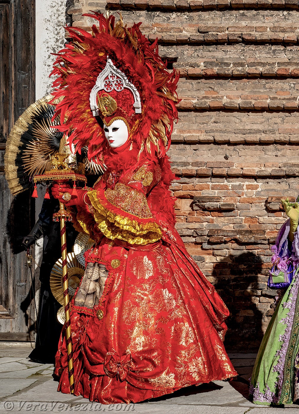La nobiltà veneziana era in primo piano e gli abiti rossi delle dame illuminavano il sagrato della chiesa di San Lorenzo.Questa magnifica signora in rosso, con il copricapo ornato dal leone di San Marco, non poteva che essere la dogaressa, la moglie del Doge di Venezia.