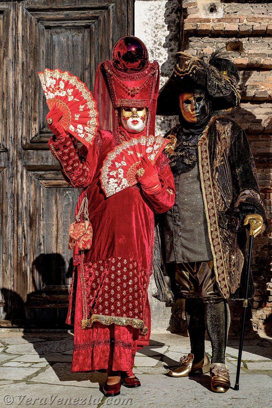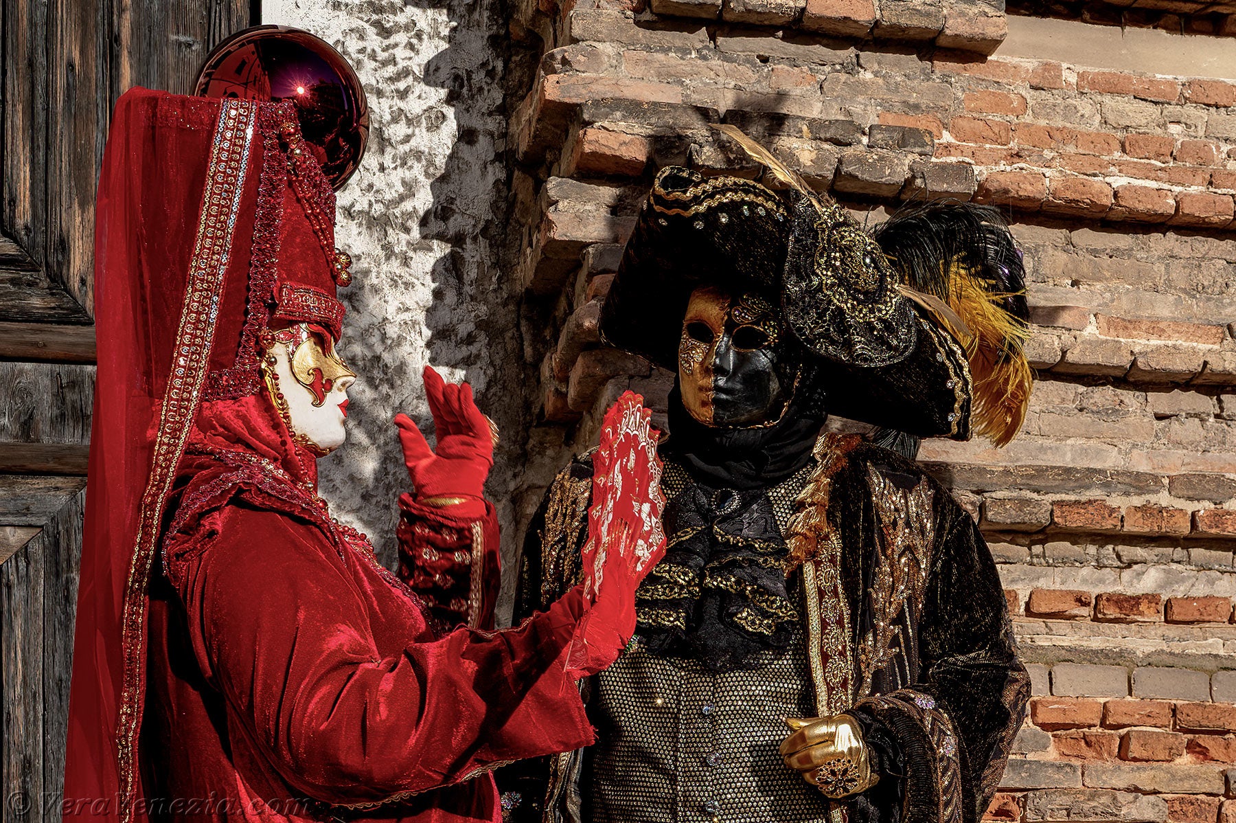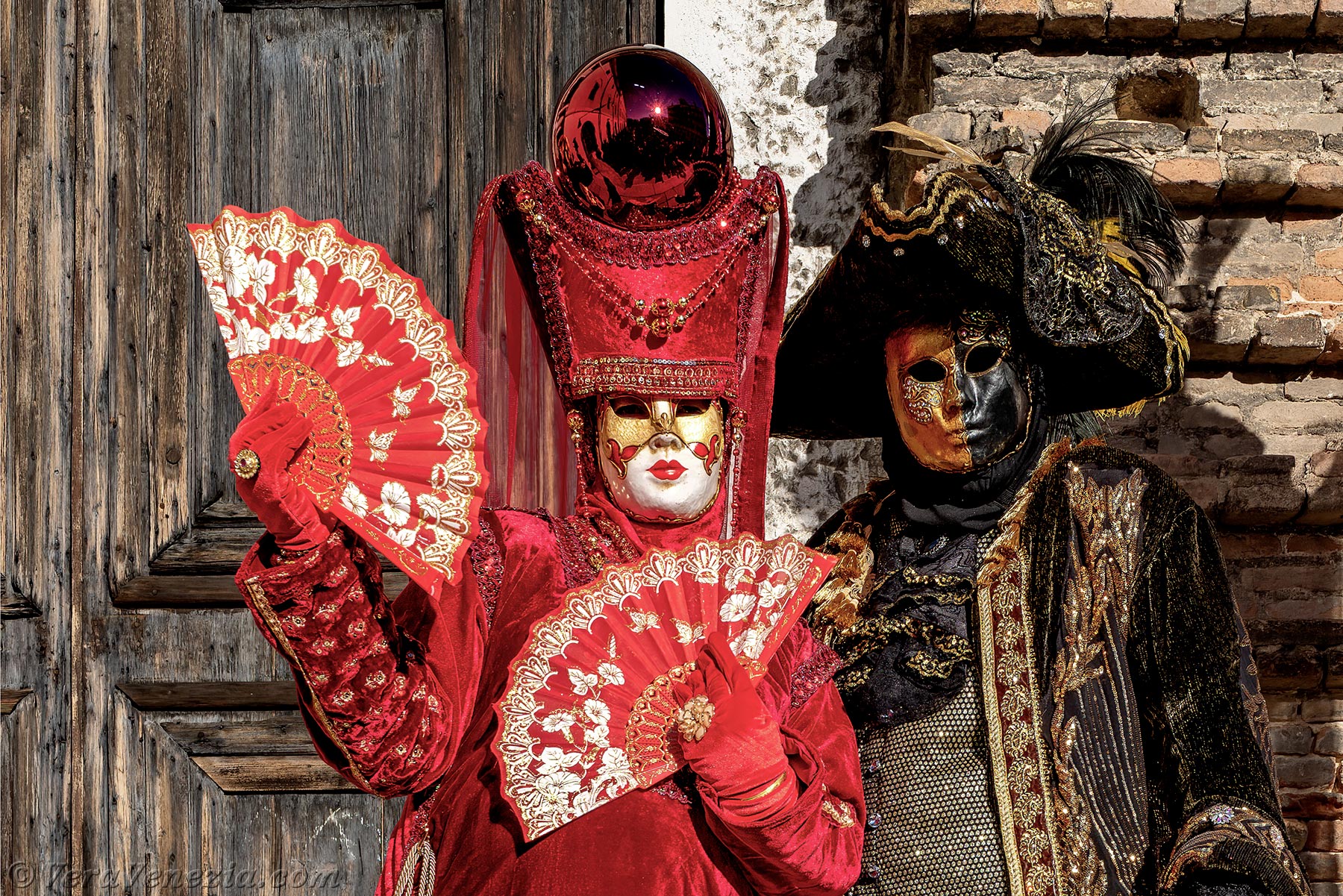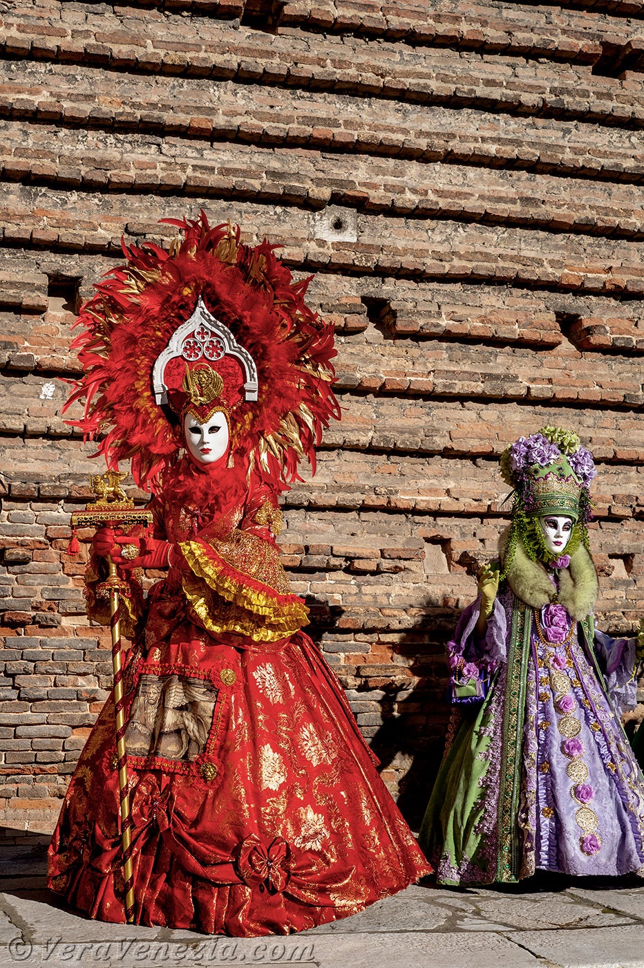 La nobiltà veneziana era in primo piano e gli abiti rossi delle dame illuminavano il sagrato della chiesa di San Lorenzo.Questa magnifica signora in rosso, con il copricapo ornato dal leone di San Marco, non poteva che essere la dogaressa, la moglie del Doge di Venezia.
