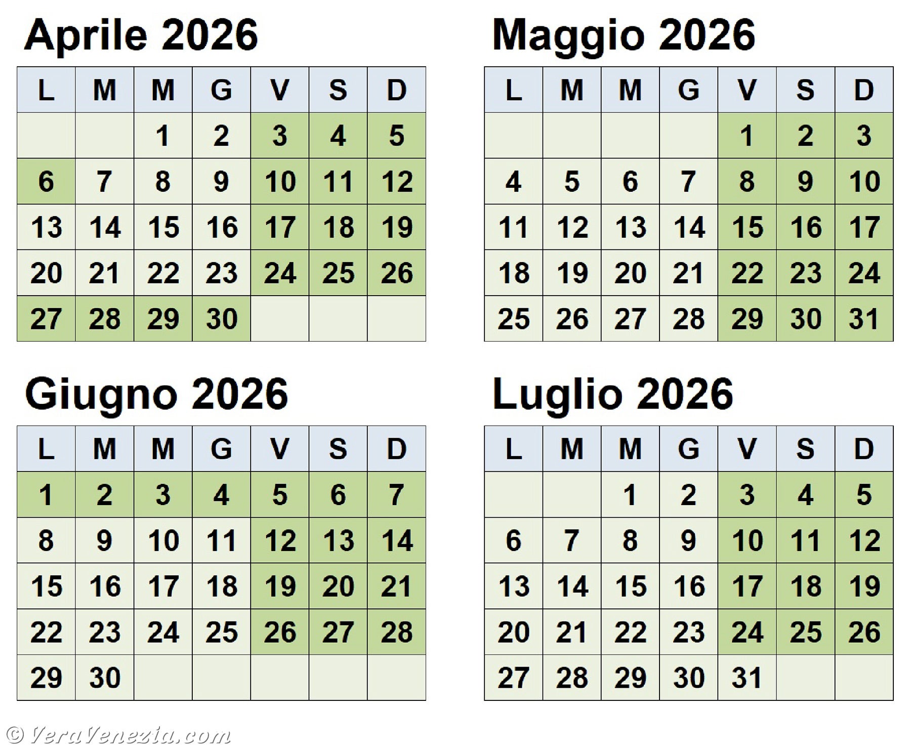 Giugno 2026: dal 1° al 7, dal 12 al 14, dal 19 al 21 e dal 26 al 28 giugno.